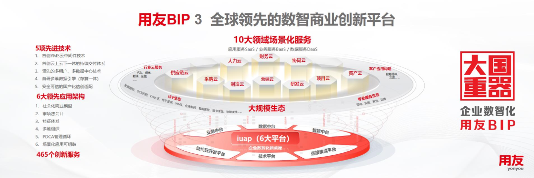 面對難得的市場和產業(yè)發(fā)展機遇,用友經過6年的規(guī)模研發(fā)、持續(xù)迭代,以全新理念、全新技術、全新架構、全新模式打造了面向企業(yè)和公共組織數(shù)智化的全新一代產品——用友BIP,并在平臺技術、應用架構、創(chuàng)新服務等方面實現(xiàn)多項重大突破與升級,達到全球水平,包括5項技術、6大應用架構、465項創(chuàng)新服務,覆蓋智能財務、數(shù)智人力、數(shù)智采購、數(shù)智營銷、智能制造、數(shù)智供應鏈、數(shù)智研發(fā)、數(shù)智項目、數(shù)智資產及協(xié)同工作等十大核心領域,是目前全球領域覆蓋較多的企業(yè)云服務群。